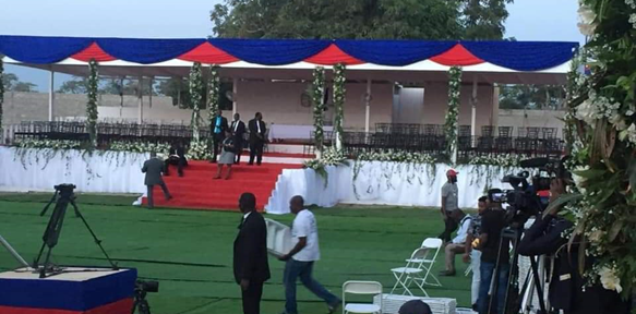 Sèkèy chèf leta ekspoze anba yon repozwà òne ak koulè nasyonal la sou yon stand ki kontoune ak yon baryè flè krisantèm ki evoke yon sèten etènite ak imòtalite. Paralèlman plizyè ofisye Lame Dayiti an unifòm seremonyèl ak bwàsa nwà ap fè lagàd akote sèkèy defen an ki parachite sou yon kapèt wouj.