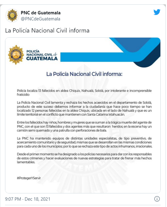 La police de Guatamalan a déclaré que différentes unités spécialisées ont été impliquées dans le maintien de la sécurité et de l’engagement avec les communautés avec des mesures égales étant fournies pour les deux. La déclaration de la police a condamné l’attaque, la qualifiant d'”inhumaine.”