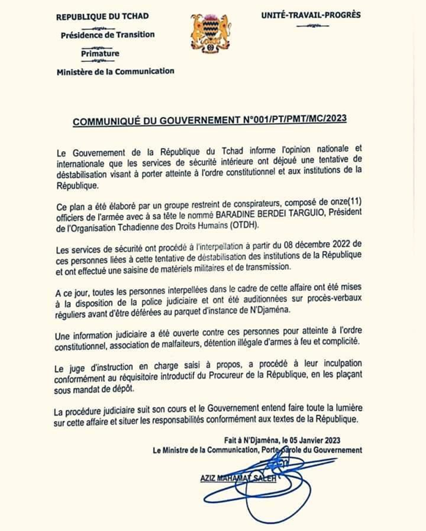 Dans un communiqué de son porte-parole, le gouvernement tchadien a annoncé que ses services de sécurité ont déjoué une tentative de coup d’état visant à renverser l’ordre constitutionnel et les institutions régaliennes. Selon N’djamena, ce plan a été élaboré par un groupe restreint de conspirateurs composé de 11 officiers et chapeauté par le président de l’Organisation tchadienne des droits humains.