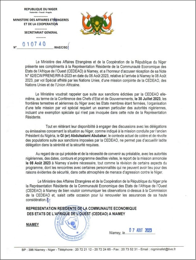 La mission tripartite de la CEDEAO, de l’Union africaine et des Nations unies, attendue ce mardi à Niamey pour tenter une médiation n’a finalement pas pu effectuer le déplacement. Et pour cause, les militaires ont notifié, à travers une note à la CEDEAO, leur incapacité à recevoir la mission ce mardi.